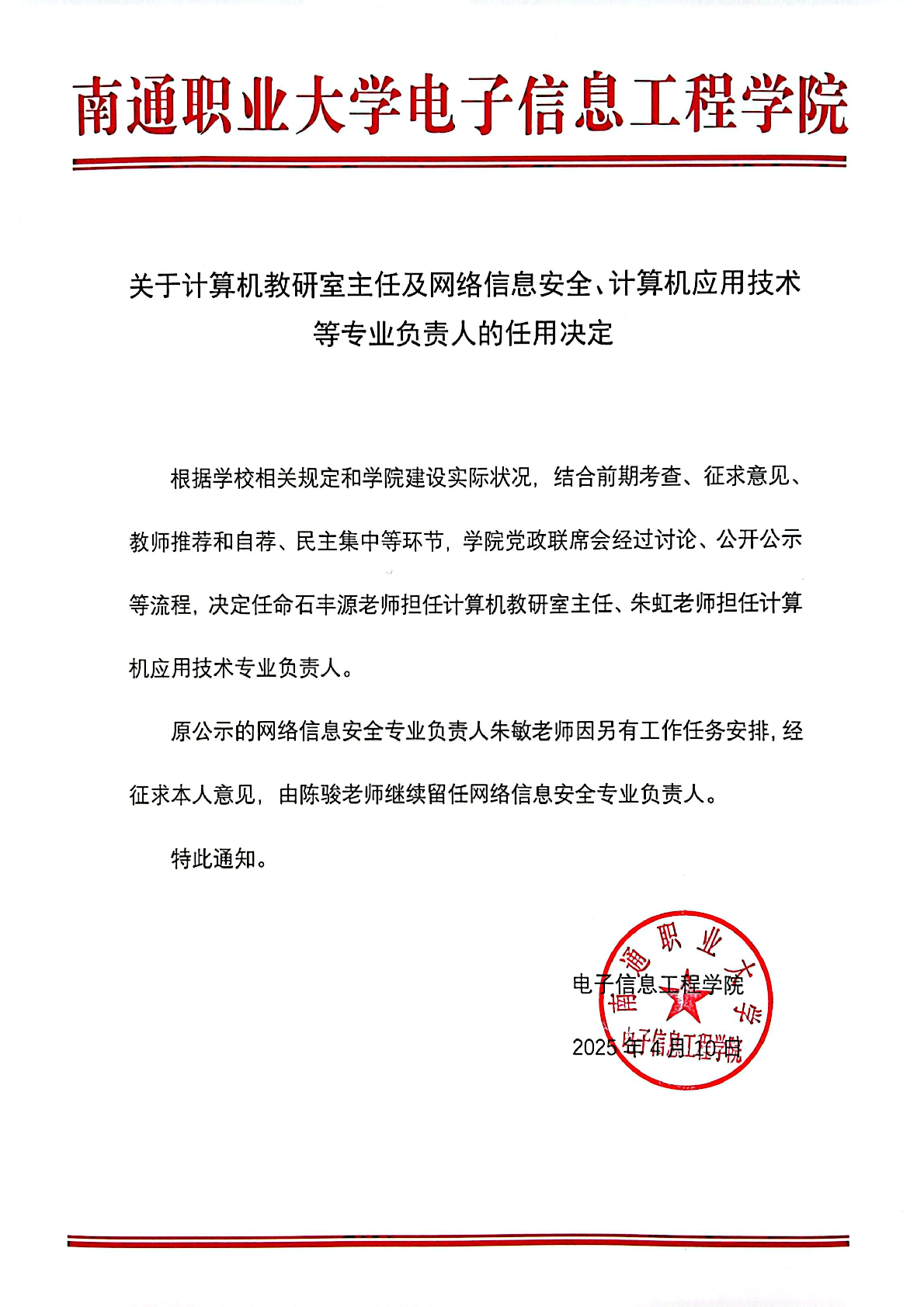 关于计算机教研室主任及网络信息安全、计算机应用技术等专业负责人的任用决定